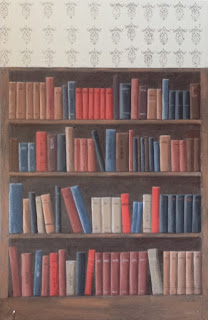 I saved the trompe l'oeil bookcase until the last minute when I had a chance to learn how to do it from watching YouTube videos. Someone said I should write mischievous titles on the books, for fun.